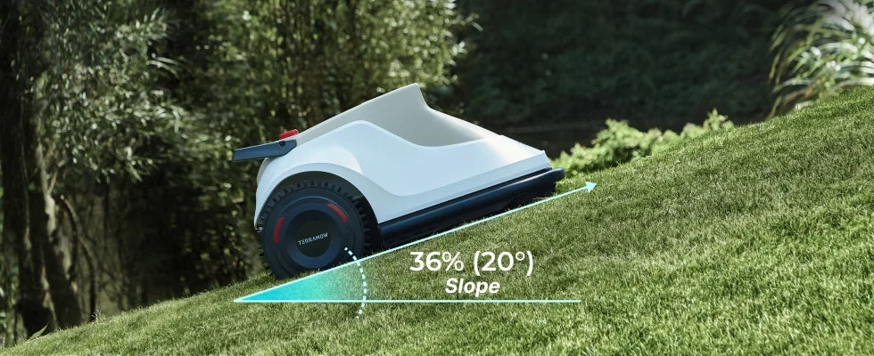 Le robot tondeuse TerraMow maîtrise les pentes jusqu’à 20° (36,4 %), couvrant 95 % des terrains résidentiels. Pas de sur-ingénierie inutile : l’objectif est de garantir une fiabilité optimale au quotidien, même sur des terrains inclinés.