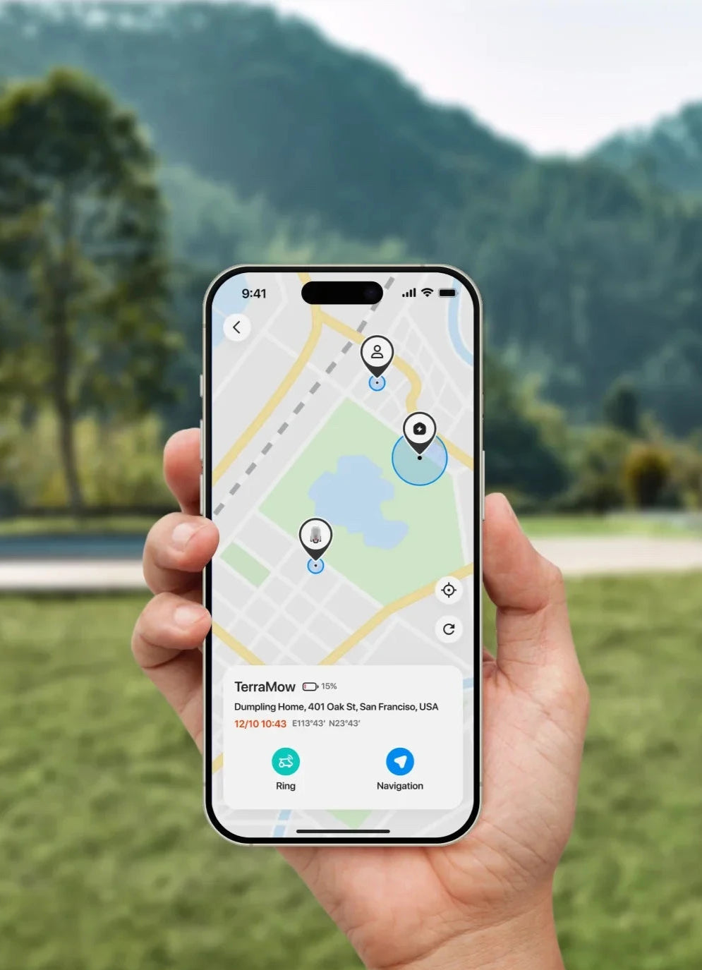 En cas de déplacement non autorisé, TerraMow se verrouille automatiquement et reste géolocalisable via l’application. Protégez votre appareil avec simplicité et précision.